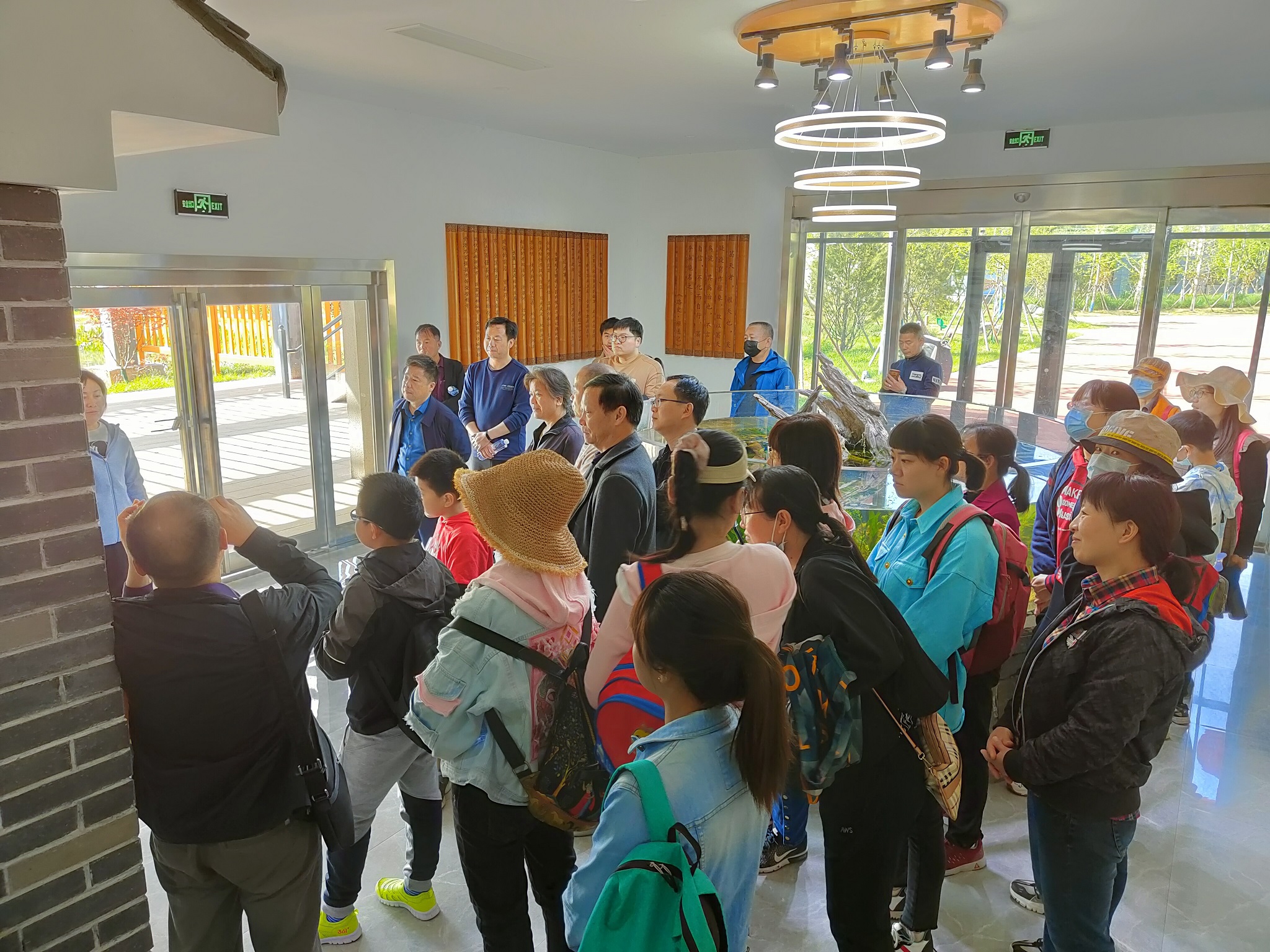 中心一行40多人在湿地公园正门集合,在工作人员的陪同下游览了湿地公园宣教馆。宣教馆内,工作人员通过对湿地宣传版面、湿地实景沙盘、湿地实景展示和白鹭、野鸭、绿头鸭等仿真动物展示的细致讲解,让大家在游览中了解了双洎河的历史典故、湿地知识及动植物常识等。