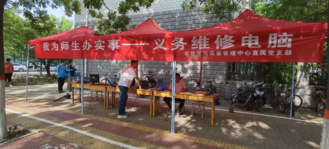 为庆祝中国共产党成立100周年,落实学校党史学习教育工作有关安排,推动党史学习教育走深走实,5月21日,实验室与设备管理中心直属党支部在家属院东小门设点开展“我为师生办实事”义务维修电脑活动,为全校师生开展义务电脑检查、维修。