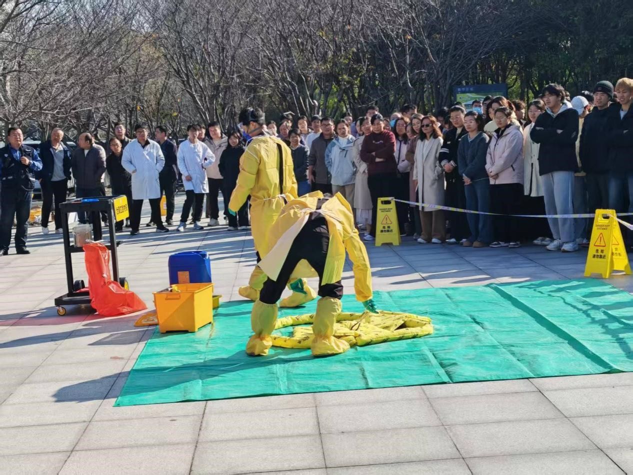 与会人员集体观摩了危化品泄漏事故应急演练。本次演练分为危险废弃物转运倾倒泄漏和实验室危险化学品泄露两个演练项目,包括人员自救逃生、启动响应机制、应急人员防护、现场处置和撤离、安全移交恢复五个环节,分别由化工与材料学院和食品与药学院的教师和学生进行现场模拟演练。演练过程中,专业公司人员就实验室危化品泄露应急处置、个人防护装备的使用方法及常见错误操作进行了详细的讲解。