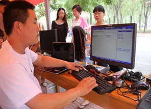 上午9时,校园内家属区东门外,“教师回报社会义务维修电脑”的红色横幅分外醒目,宽大的展板上“电脑提速、系统安装、电脑除尘、故障排除”等服务内容一目了然。公共实验中心的工作台前,围满了前来咨询和维修电脑的教师和学生。王红祥、贾红杰、王铮、刘红永等计算机技术教师,带领8名“计算机技术实训基地”的学生学员,紧密配合,分工协作,耐心回答咨询,细致演示讲解,熟练检测拆装,上门排除故障,忙碌而有条不紊地对问题台式电脑、笔记本电脑进行“诊治”。