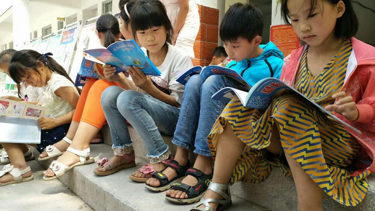 孩子们在看赠送的《科学素质知识读本》和《慧眼识邪漫画月刊》