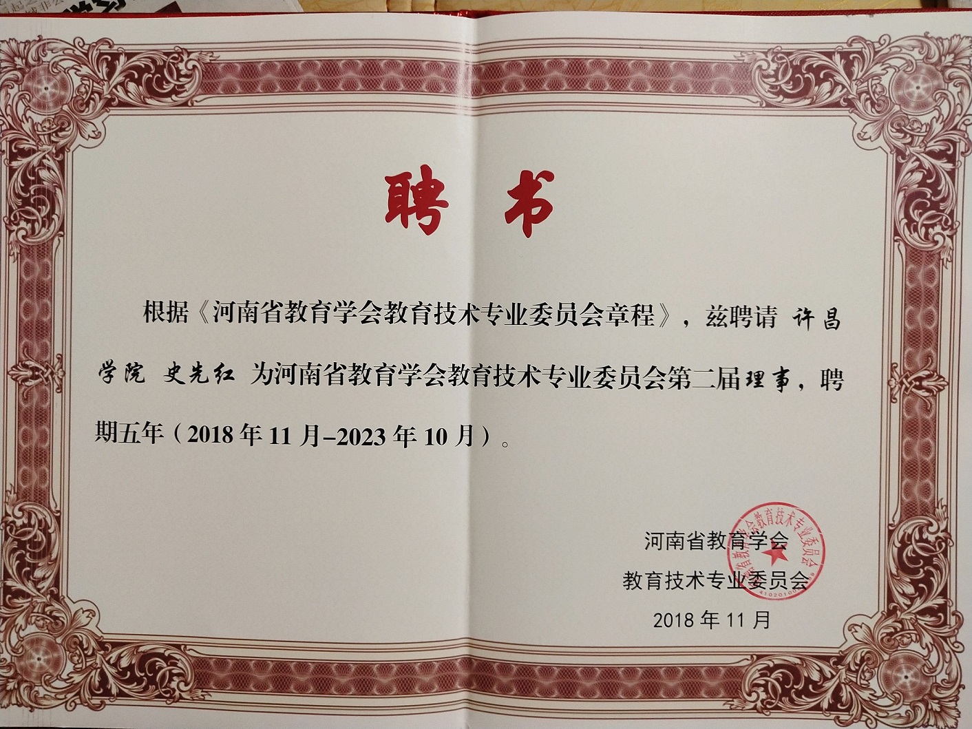 2018年11月24日至25日,河南省教育学会教育技术学专业委员会第7届学术年会暨数字教育变革与创新发展研讨会在郑州市大象出版社召开。许昌学院被确定为委员会第二届理事单位,我中心刘雪锋和史先红分别被聘为常务理事和理事。