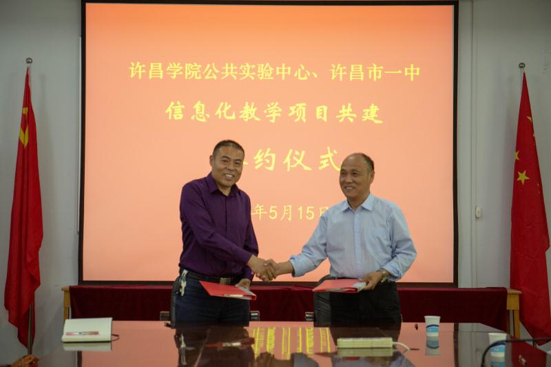 5月15日上午,许昌学院公共实验中心、许昌市一中信息化教学项目共建签约仪式在公共实验中心D208会议室举行。公共实验中心主任李志业、市一中校长张卫锋、副校长宋颖超、许昌市数字化学习工程技术研究中心全体成员出席签约仪式,会议由公共实验中心主任李志业主持。
