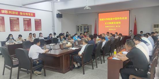 本次党课,蔡子亮书记以“抗疫斗争彰显中国特色社会主义制度优越性”为题,从彰显坚持党的集中统一领导的制度优势、彰显密切联系群众的制度优势、彰显全面依法治国的制度优势、彰显集中力量办大事的制度优势四个方面详细生动地分析了疫情防控工作中取得的显著成效。