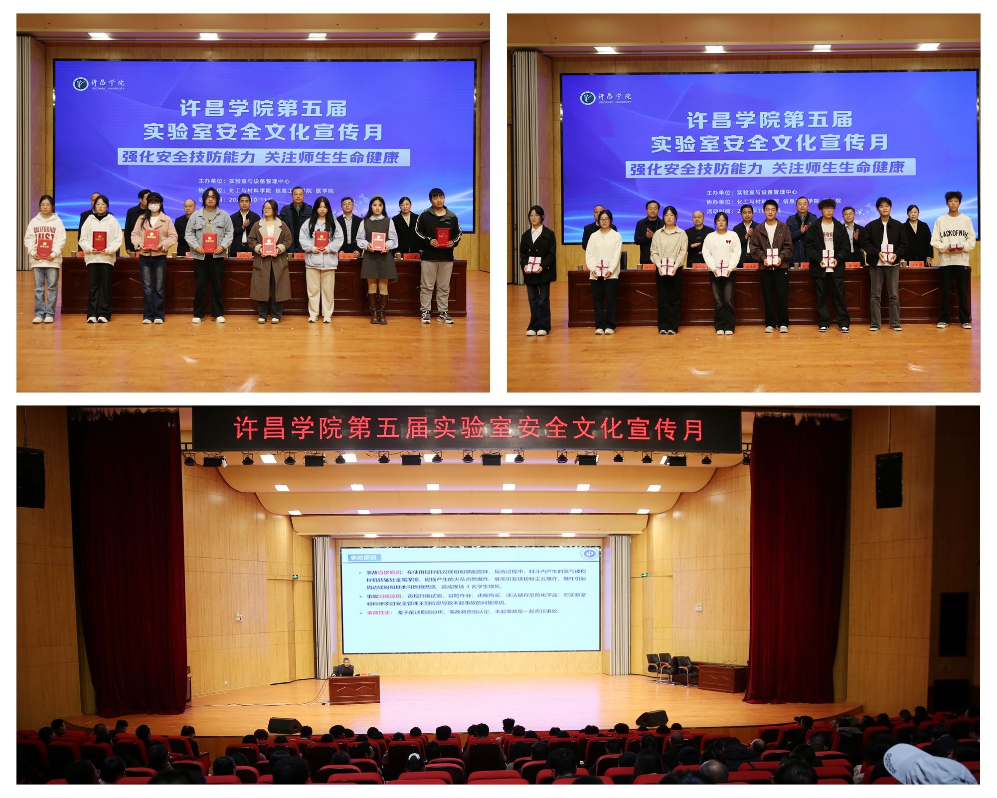 会上,实验室与设备管理中心主任刘雪锋通报了2025年以来四次全校实验室安全检查情况;化工与材料学院教师李伟、医学院学生冯依然分别作为教师和学生代表发言;与会领导共同为学生代表发放了《许昌学院实验室安全手册》,为2025年实验室安全微视频制作和海报设计大赛获奖学生代表颁奖。